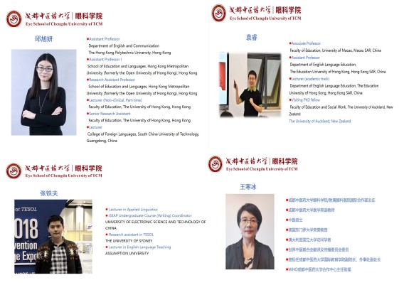 国合部部长王寒冰介绍了协会指导老师团队情况,协会指导老师共计8人,语言组指导老师来自香港理工大学邱旭妍教授、澳门大学袁睿教授、电子科技大学张铁夫老师和成都中医药大学眼科学院王寒冰老师;专业组指导老师来自成都中医药大学眼科学院张富文研究员、成都中医大银海眼科医院孔玮主任医师、潘学会主任医师、王博副主任医师、尹朔主治医师和代炳灵主治医师。