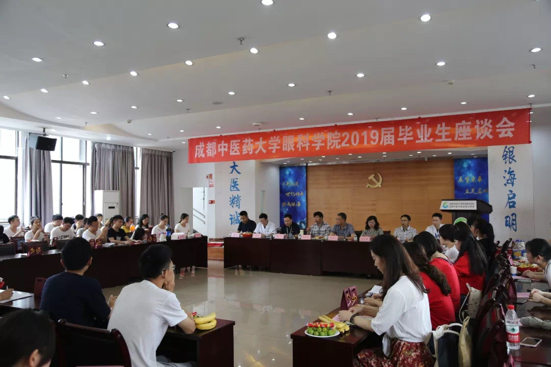 6月14日下午,成都中医药大学眼科学院2019届毕业生座谈会在成都中大银海眼科医院学术报告厅召开。校长余曙光、院党委书记/院长段俊国、副院长路雪婧、教师代表、毕业班辅导员、在校生代表以及2019届本科、硕博毕业生参加座谈会。座谈会由院党委副书记陶铮主持。