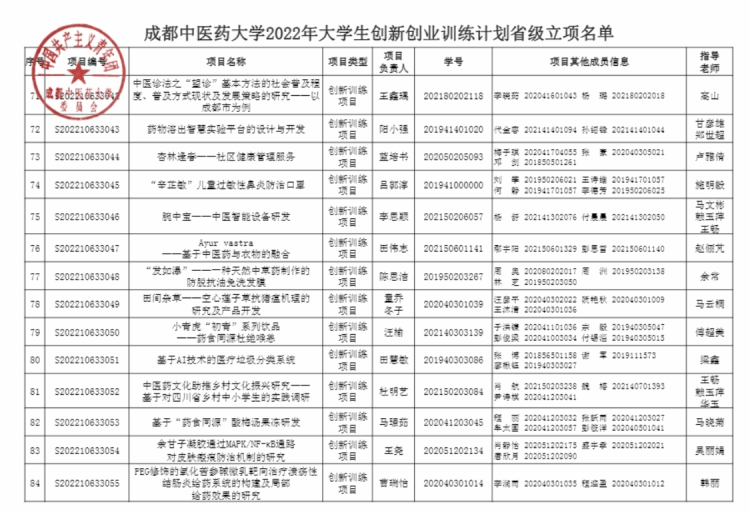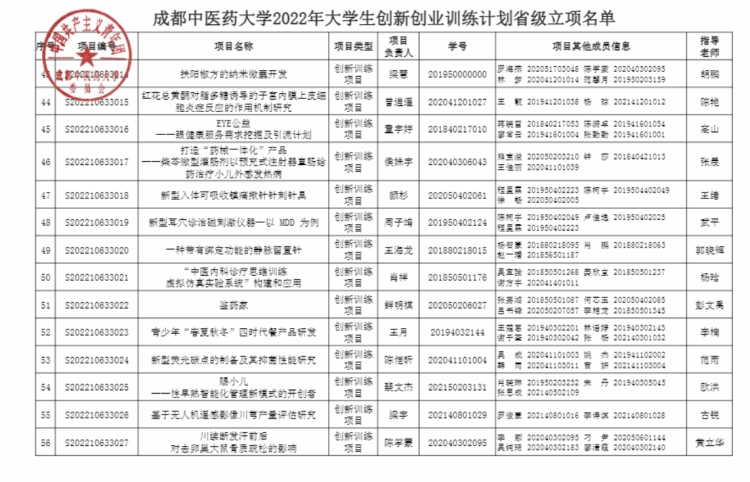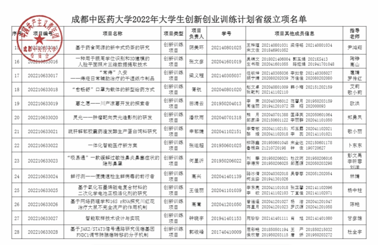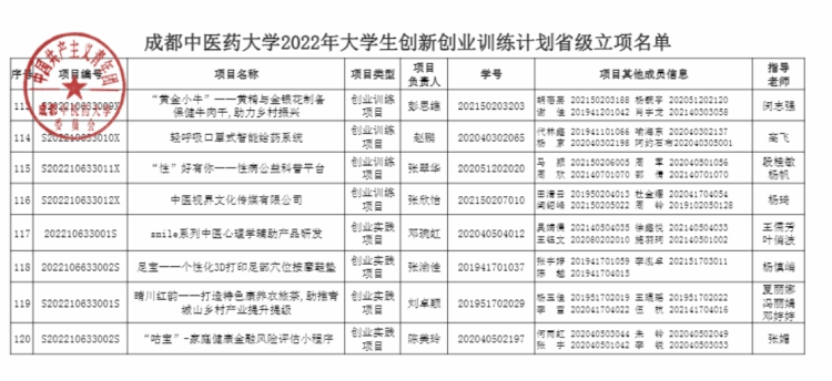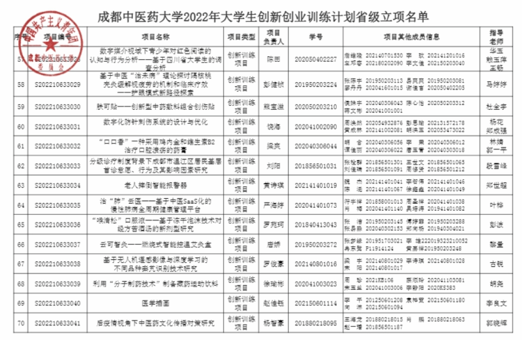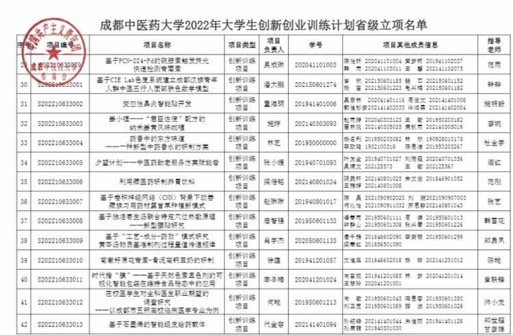 根据成都中医药大学 2022 年大学生创新创业训练计划立项工作的通知要求,校团委积极开展了2022年大学生创新创业训练计划立项工作,现已完成立项名单公示,我院共有3个项目入选。
